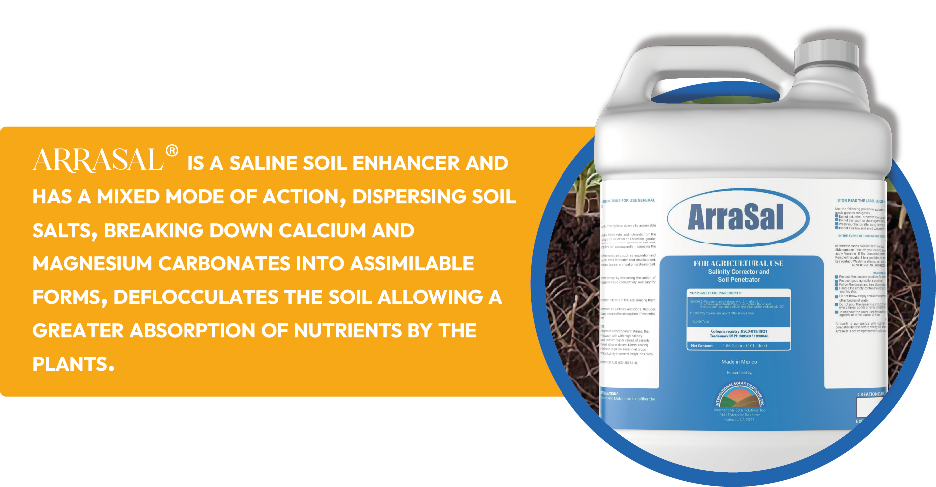 ARRASAL is a Saline soil improver (removes salts, facilitating the assimilation of Ca and Mg), improves and accelerates germination, unlocks elements becoming available for the plant, acts as a penetrant, dispersant (greater aeration and oxygenation of the root mass), serves as a descaling agent in irrigation tapes, reduces compaction and puts saline soils back to work.